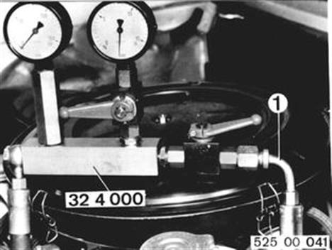 Die von der Flügelpumpe abgeschraubte Druckleitung (1) am Druckmesser 32 4 000 anschließen. | ![]() |