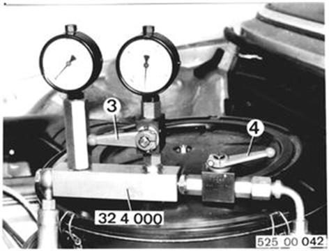 Motor laufen lassen. Lenkrad mit 100 N ca. 5 Sekunden gegen Endanschlag ziehen. Druck am Druckmesser 32 4 000 ablesen. Die gleiche Messung bei Rechtseinschlag durchführen. Liegen die ermittelten Drücke unter dem max. Pumpendruck¹), muß das Lenkgetriebe ersetzt werden. ¹) Siehe technische Daten