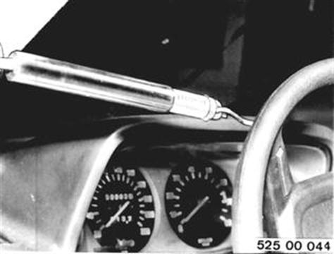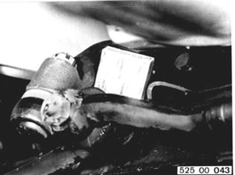 C) Mechanisches Spiel in der Lenkung prüfen -Druckpunkt ist eingestellt- Lenkstockhebel in Geradeausfahrtstellung festsetzen - Feststellvorrichtung 32 4 040. Dazu Schelle lösen. Leitungen anheben. | ![]() |