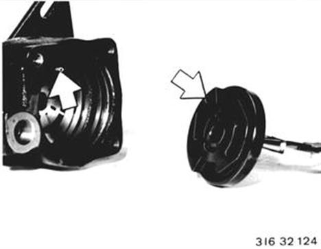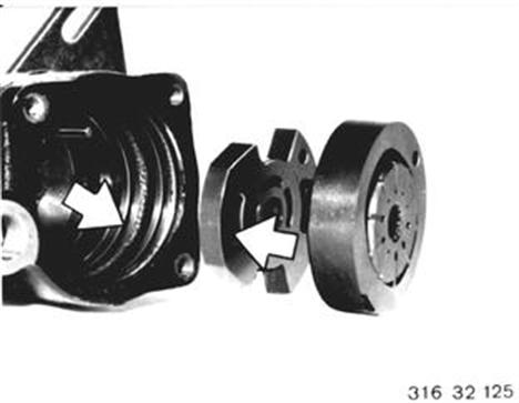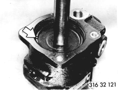 O-Ring ausheben. Kurvenring mit Läufer und Stirnplatte antriebsseitig durch klopfen auf eine ebene Unterlage herausnehmen. Einbauhinweis: Die Einfräsungen an der Stirnplatte zeigen zum Läufer. | ![]() |