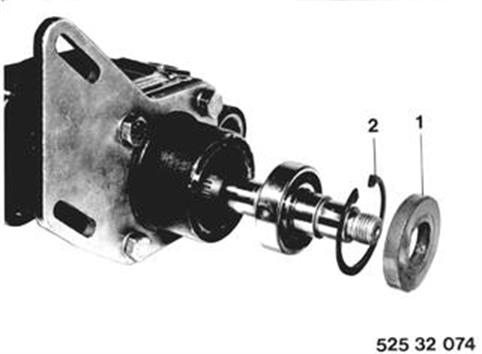 Wellendichtung (1) ausheben. Seegerring (2) ausbauen. Antriebswelle und Kugellager aus Gehäuse pressen. Einbauhinweis: Wellendichtring ersetzen. Dichtlippe des Wellendichtringes einölen. | ![]() |