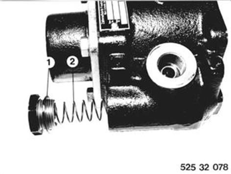 Verschraubung mit Dichtring (1) und Druckfeder (2) abbauen. Einbauhinweis: Dichtringstärke (1) und Druckfederlänge (2) nicht verändern. | ![]() |