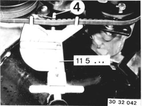 Keilriemenspannung mit Prüfgerät 115... prüfen. Haken (4) liegt auf Zahnspitze auf. Schrauben festziehen. Achtung! Auf ausreichenden Abstand der Schläuche zu karosseriefesten Teilen achten, ggf. Korrektur an der Schlauchverschraubung vornehmen.