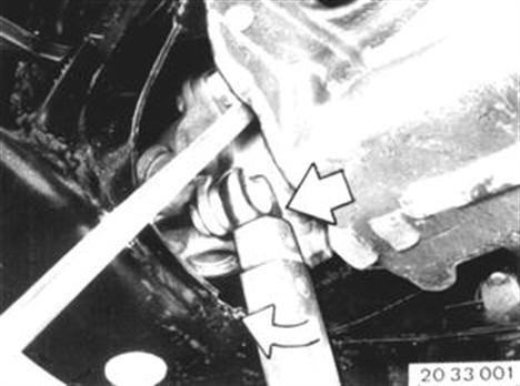 Kabel vom Impulsgeber-Tachometer abziehen. Befestigungsschraube vom Gummilager lösen und Hinterachsgetriebe absenken. Einbauhinweis: Anziehdrehmoment*). Ölstand prüfen, ggf. nur freigegebenes Hinterachsgetriebeöl auffüllen, siehe Betriebsstoff-Vorschriften-Ordner Gr. 33  *) Siehe Technische Daten |  |