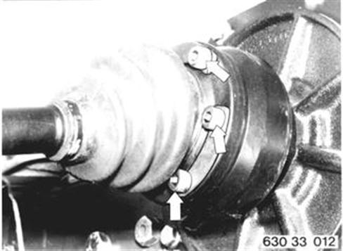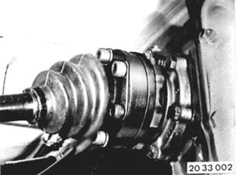 Fahrzeuge vor Modellwechsel 1982  HINTERACHSGETRIEBE AUS- UND EINBAUEN Gelenkwelle lösen. Einbauhinweis: Selbstsichernde Muttern erneuern. Muttern mit Schlüsselkopf 26 1 050 in Verbindung mit Drehmomentschlüssel anziehen. Anziehdrehmoment¹).  ¹) Siehe technische Daten |  |