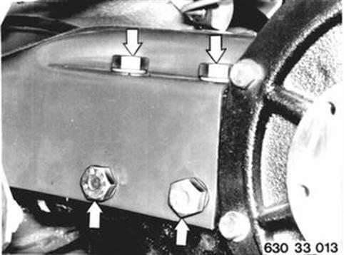 Hinterachsgetriebe mit Wagenheber  abstützen. Vordere Schrauben links und rechts lösen. Einbauhinweis: Anziehdrehmoment*).  *) Siehe Technische Daten |  |