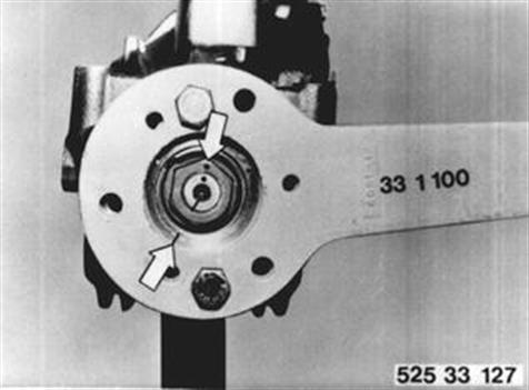Antriebsflansch und Bundmutter zum Ritzel zeichnen. Antriebsflansch mit Halteschlüssel 33 1 100 gegenhalten und Bundmutter lösen. Einbauhinweis: Anziehdrehmoment¹).  ¹) Siehe technische Daten |  |