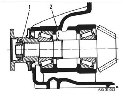 Gesamtreibwert neu ermitteln. Beispiel: Gesamtreibwert von der Demontage.....................250 Ncm Neuer Wellendichtring...+ 20 Ncm ___________________________ Neuer Gesamtreibwert auf.................................270 Ncm einstellen. Achtung! Die Bundmutter (1) muß mit mindestens 150 Nm angezogen sein. Werden 150 Nm nicht erreicht oder der neu ermittelte Gesamtreibwert überschritten, muß die Spannbüchse (2) erneuert und der Meßvorgang wiederholt werden. Bundmutter mit Sicherungsblech sichern. Öl¹) auffüllen.  ¹) Siehe technische Daten |  |
