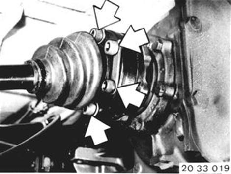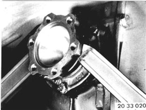 Fahrzeuge nach Modellwechsel 1982 WELLENDICHTRING FÜR MITNEHMERFLANSCH ERSETZEN Abtriebswelle am Mitnehmerflansch abbauen und hochbinden. Einbauhinweis: Anziehdrehmoment*). *) Siehe technische Daten
