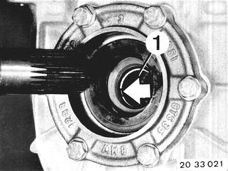 Einbauhinweis: Wellendichtring in HA-Getriebeöl tauchen. Wellendichtring mit der Schlaghülse 33 1 200 in Verbindung mit Griff 00 5 500 bis zum Anschlag eintreiben. Mitnehmerflansch bei stark eingelaufener Lauffläche ersetzen. | ![]() |