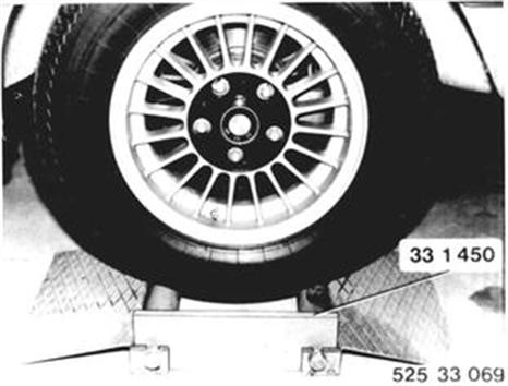 Fahrzeuge vor Modellwechsel 1982  SPERRDIFFERENTIAL KPL. ERSETZEN Funktionsprüfung im eingebauten Zustand: a) Ebener Werkstattboden. b) Fahrzeug mit dem linken Hinterrad auf das Rollengestell 33 1 450 fahren. c) Handbremse völlig lösen. d) 1. Gang einlegen und Motor beschleunigen. e) Das Sperrdifferential ist funktionsmäßig in Ordnung, wenn sich das Fahrzeug vom Rollengestell 33 1 450 fahren läßt. |  |