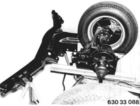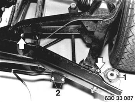 Fahrzeuge vor Modellwechsel 1982  HINTERACHSTRÄGER ERSETZEN Hinterachsträger kpl. aus- und einbauen 33 31 000. Längslenker abstützen. Gummilager (1) und Lagerbock für Stabilisator (2) abbauen. Längslenker lösen. Einbauhinweis: Gummilager (1) vermitteln und endgültig am Fahrzeug anziehen. Schrauben in Normallage¹) festziehen.  33 31 000  ¹) Siehe technische Daten |  |