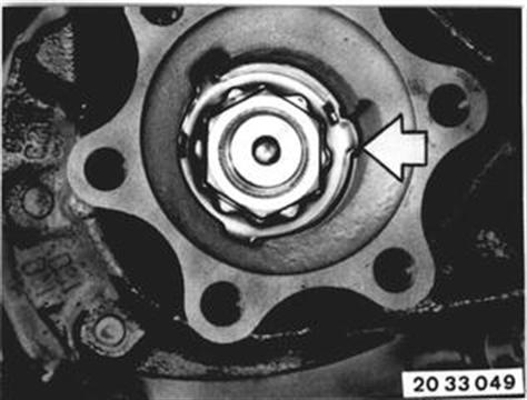Bundmutter bündig mit Wellenende aufschrauben und mit Nylonhammer austreiben. Einbauhinweis: Verzahnung prüfen. Mitnehmerflansch prüfen, ggf. Flansch ersetzen.