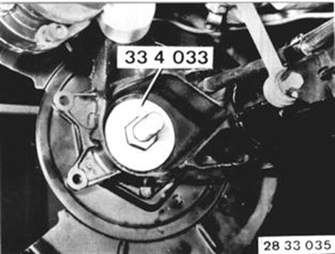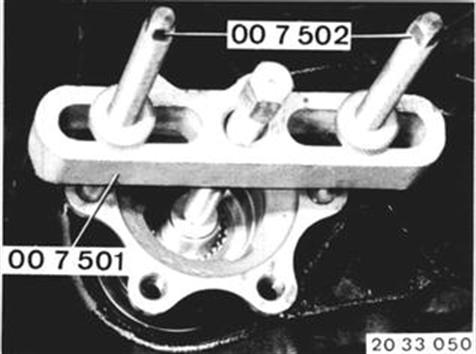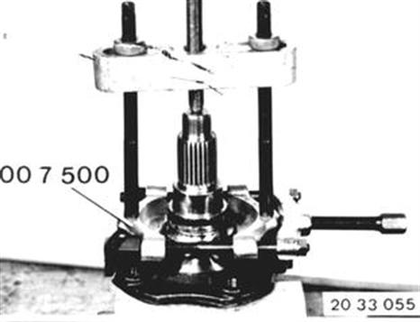 Halteschlüssel 33 4 000 anbauen. Bundmutter lösen, Mitnehmerflansch mit Werkzeug 00 7 501 in Verbindung mit Spindel 00 7 502 abziehen.