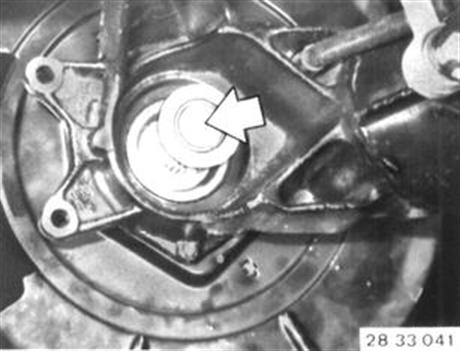 Fahrzeuge nach Modellwechsel 1982 RADLAGER UND WELLENDICHTRINGE ERSETZEN Abtriebswelle am Mitnehmerflansch lösen und hochbinden. Bremsscheibe hinten aus- und einbauen.