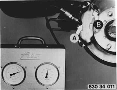 Fahrzeuge vor Modellwechsel 1982  FUSSBREMSE ÜBERPRÜFEN - HOCHDRUCK- UND NIEDERDRUCKPRÜFUNG Hochdruck-Dichtheitskontrolle: Vorderrad ab- und anbauen 36 10 300. Kontrolle an beiden Bremskreisen durchführen. Entlüftungsschraube des 1. Bremskreises (A) herausschrauben. Druckprüfer anschließen und entlüften. 2. Bremskreis (B).  36 10 300 |  |