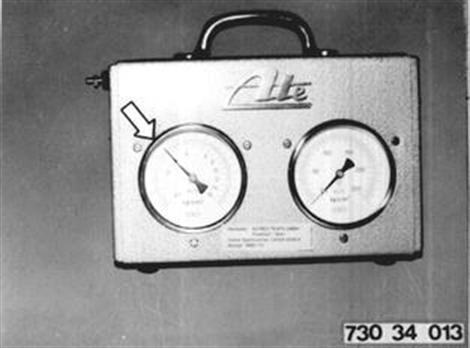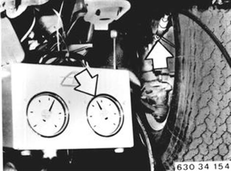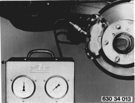 Niederdruckprüfung: An beiden Bremskreisen durchführen. Pedalstütze zurückstellen, daß Prüfdruck im Bremssystem 2...5 bar beträgt. Fahrzeug und Anzeigegerät müssen ruhig stehen, da Bewegungen das Ergebnis verfälschen. Während 5 Minuten Prüfdauer muß der Druck konstant bleiben. Bei starkem Druckabfall alle Gummiteile überprüfen. Nach Beendigung der Prüfung Bremssattel entlüften. |  |