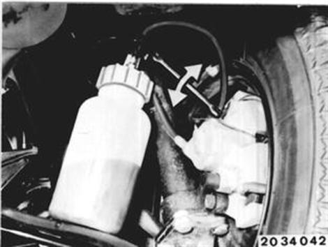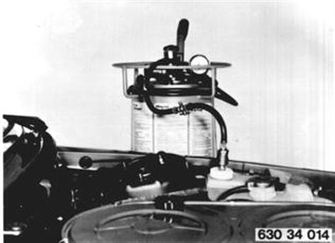 Fahrzeuge vor Modellwechsel 1982  BREMSE ENTLÜFTEN Bremsflüssigkeit¹) muß jährlich erneuert werden. Die Bremsflüssigkeit ist hygroskopisch und nimmt daher durch das Luftloch im Ausgleichbehälter Feuchtigkeit aus der Luft auf. Dadurch wird der Siedepunkt der Bremsflüssigkeit auf 160 ... 180°C herabgesetzt. Achtung! Keine Bremsflüssigkeit mit der Lackierung des Wagens in Berührung bringen. Bremsflüssigkeit zerstört die Lackierung. Entlüftergerät am Ausgleichbehälter anschließen. Achtung! Der Fülldruck darf 2 bar (atü) nicht überschreiten.  ¹) Siehe technische Daten |  |