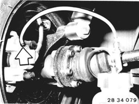 Bremsfußhebel in durchgetretener Stellung  festhalten. Entlüfterventil schließen. Bremsfußhebel lösen. Vorgang hinten links, vorne rechts und vorne links (wie für hinten rechts beschrieben) wiederholen. Bei M 635 CSi: Vorderräder abbauen (Festsattelbremse). Beide Entlüfterschrauben entlüften. |  |