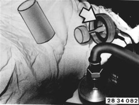 Fahrzeuge nach Modellwechsel 1982  Bremsflüssigkeit*) muß jährlich erneuert werden. Die Bremsflüssigkeit ist hygroskopisch und nimmt daher durch das Luftloch im Ausgleichbehälter Feuchtigkeit aus der Luft auf. Dadurch wird der Siedepunkt der Bremsflüssigkeit von + 240° auf 160...180° C herabgesetzt. Achtung! Keine Bremsflüssigkeit mit der Lackierung des Wagens in Berühung bringen. Bremsflüssigkeit zerstört die Lackierung. Entlüftungsgerät am Ausgleichbehälter anschließen. Bedienungsanleitung des jeweiligen Geräteherstellers beachten. Der Fülldruck darf 2 bar nicht überschreiten. Einbauhinweis: Auf Deckeldichtung achten. Achtung! Keine Luftspülung verwenden. Dadurch wird der Entlüftungsvorgang bei ABS wesentlich erschwert. *) Freigegebene Bremsflüssigkeit siehe Service-Information Gr. 00 - Betriebsstoffe |  |