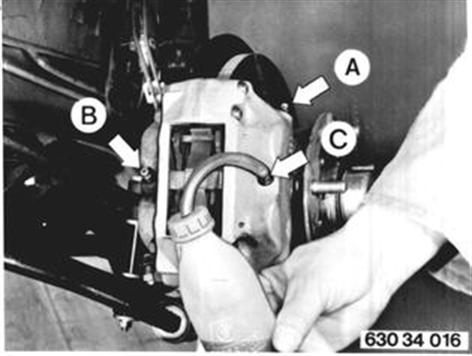 Vorderradbremse: Vorderrad ab- und anbauen 36 10 300. Entlüfterschlauch mit Auffangbehälter auf Entlüfterschraube stecken. Entlüfterschraube öffnen. Wenn keine Luftblasen mehr entweichen, Entlüfterschraube schließen. Achtung! An allen drei Entlüfterschrauben A, B und C entlüften, da sonst Luftblasen im Festsattel zurückbleiben können. Die beiden unteren Kolben grundsätzlich in der Reihenfolge B-C entlüften.  36 10 300 |  |