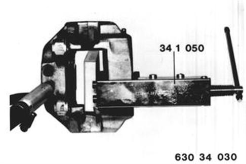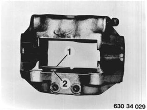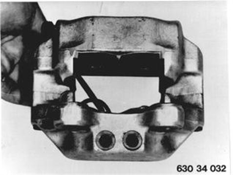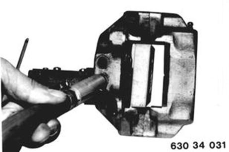 Einen Kolben mit der Kolbenrücksetzzange 34 1 050 festziehen. Eine ca. 8 mm dicke Schonerplatte (Hartholz, Hartfilz o.ä.) zum Schutz der Kolben in den Sattelschacht legen. Kolben durch die Anschlußbohrung mit Druckluft herausdrücken. Achtung! Vorsicht! 10 bar (atü) Druckluft ergeben eine Kraft von ca. 1250 N (125 kp).