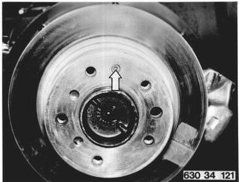 Fahrzeuge vor Modellwechsel 1982 BREMSSCHEIBE HINTEN AUS- UND EINBAUEN Hinterrad ab- und anbauen 36 10 320. Festsattel abbauen. Bremsleitung aus Schelle lösen. Achtung! Bremsleitung bleibt angeschlossen. Schraube lösen und Bremsscheibe abnehmen. Einbauhinweis: Anziehdrehmoment¹). Achtung! Beim Ersetzen der Bremsscheibe müssen grundsätzlich beide Bremsscheiben einer Achse ausgetauscht werden. Handbremse einstellen 34 10 014. 36 10 320 ¹) Siehe technische Daten 34 10 014