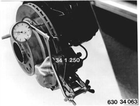 Fahrzeuge vor Modellwechsel 1982  BREMSSCHEIBE HINTEN AUF SCHLAG UND STÄRKENDIFFERENZ PRÜFEN -HINTERRAD ABGEBAUT- Bremsklötze ausbauen. Bremsscheibe zusätzlich befestigen. Meßuhrhalter 34 1 250 anbringen und Seitenschlag¹) der Bremsscheibe mit Meßuhr prüfen.  ¹) Siehe technische Daten |  |