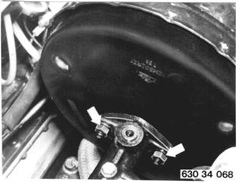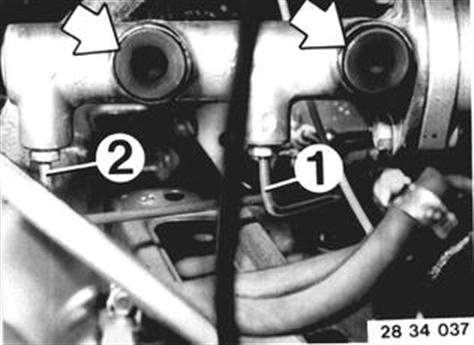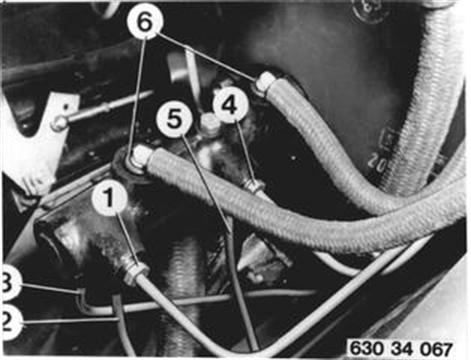 Luftfilter ab- und anbauen. Schläuche vom Tandem-Hauptbremszylinder abziehen und hochlegen. Achtung! Rohrwinkel nicht herauskippen - vorsichtig senkrecht nach oben herausziehen. Bei unsachgremäßem Ausbau können Rohrwinkel im Knick brechen. Auf richtigen Sitz der Dichtstopfen (6) im Tandem-Hauptbremszylinder achten. Bremsleitungen lösen. 1 vorne rechts 2 vorne links...................1. Bremskreis 3 Hinterradbremse 4 vorne rechts 5 vorne links...................2. Bremskreis Einbauhinweis: Anziehdrehmoment¹).  ¹) Siehe technische Daten |  |