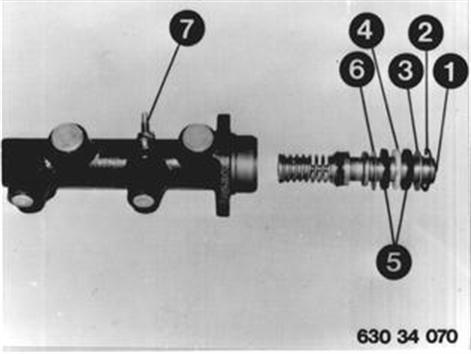 Fahrzeuge vor Modellwechsel 1982  TANDEM-HAUPTBREMSZYLINDER ÜBERHOLEN Achtung! Reparatursatz verwenden. Tandem-Hauptbremszylinder aus- und einbauen 34 31 000. Kolben (1) leicht unter Druck setzen. Anschlagschraube (7) lösen. Seegerring (2) ausheben und Kolben (1) herausziehen. Anschlagscheibe (3), Sekundärmanschetten (5), Zwischenring (4) und Lagerring (6) abstreifen. Einbauhinweis: Kolben (1) bei Einbau der Anschlagschraube (7) leicht unter Druck setzen. Kupferdichtring unter der Anschlagschraube ersetzen. Kolbenschaft mit Siliconfett bestreichen.  34 31 000 |  |