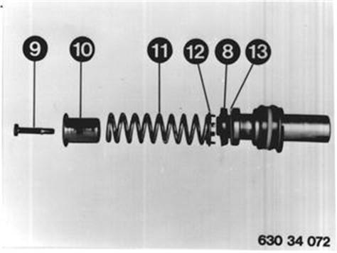Zum Ersetzen der Primärmanschette (8) Verbindungsschraube (9) lösen. Federteller (10), Feder (11), Stützring (12), Primärmanschette (8) und Füllscheibe (13) abziehen. Einbauhinweis: Darauf achten, daß der Stützring (12) einwandfrei an der Primärmanschette (8) anliegt. |  |