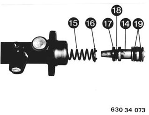 Zwischenkolben (14) durch leichte Schläge des Gehäuses auf einer Holzunterlage herausklopfen. Feder (15), Stützring (16), Primärmanschette (17) und Fallscheibe (18) abziehen. Trennmanschetten (19) ausheben. Einbauhinweis: Trennmanschetten (19) im Rep.-Satz sind mit einem Farbring gekennzeichnet. Trennmanschetten (19) so montieren, daß beide Lippen entgegengesetzt zeigen. Auf Stützring (16) achten, muß einwandfrei an Primärmanschette (17) anliegen. |  |
