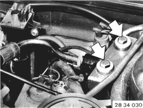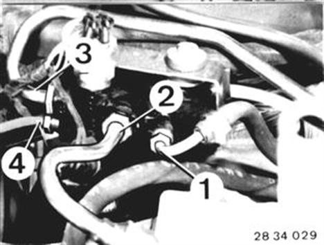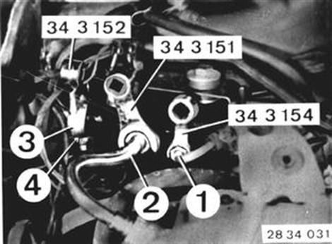 Achtung! Der DS-Regler im H 31-System kann durch feste Schmutzteilchen in seiner Funktion beeinträchtigt werden, was zum Ausfall der Lenk- und Bremskraftverstärkung führen kann. Es ist darauf zu achten, daß alle Rohr- und Schlauchleitungen bei der Montage frei von Verunreinigungen sind. Einbauhinweis: Leitung (1) mit 34 3 154, Leitung (2 und 4) mit 34 3 151, Leitung (3) mit 34 3 152 in Verbindung mit einem Drehmomentschlüssel anziehen. Anziehdrehmoment*). Hydrolenkung entlüften 32 13 006.  *f) Siehe technische Daten   |  |