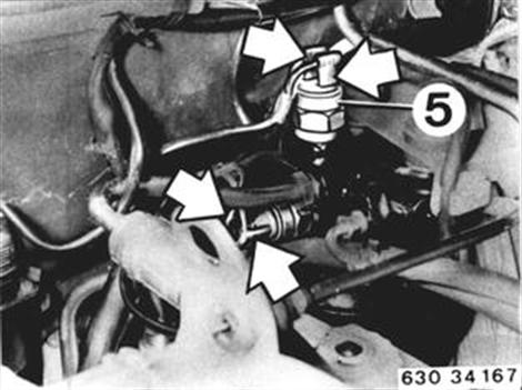 Fahrzeuge nach Modellwechsel 1982  DS-REGLER AUS- UND EINBAUEN Durch ca. 20 Betätigungen des Bremspedals - bei abgestelltem Motor - mit dem einer Vollbremsung entsprechendem Kraftaufwand den Hydrospeicher entleeren. Kabel vom Umlaufdruck-Warnschalter (5) und vom Hydraulikdruckschalter abziehen. |  |