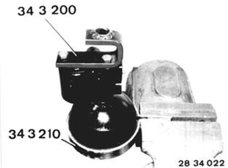 Fahrzeuge nach Modellwechsel 1982  HYDROSPEICHER AUS- UND EINBAUEN DS-Regler aus- und einbauen 34 33 100. Hydrospeicher mit Spannband 34 3 210 einspannen. Montagevorrichtung 34 3 200 am DS-Regler so befestigen, daß das Vierkant zum Gewinde des Hydrospeichers zeigt. Hydrospeicher lösen. Einbauhinweis: Anziehdrehmoment für Hydrospeicher*).  34 33 100  *) Siehe technische Daten |  |