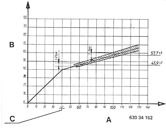 Bremspedal mind. 5 mal kräftig betätigen. Mit Pedalstütze den Bremsfußhebel hineindrücken. Bis zu einem Druck von 20 bar (atü) müssen beide Hochdruckmanometer gleiche Werte anzeigen. Ab 20 bar (atü) muß sich der Druck am hinteren Radbremszylinder entsprechend dem Diagramm vermindern. A = Eingangsdruck B = Ausgangsdruck C = Streuband Beispiel: Eingangsdruck (=Vorderachsdruck) Weichen die gemessenen Werte von den Sollwerten ab, so ist der Bremskraftregler zu erneuern. |  |