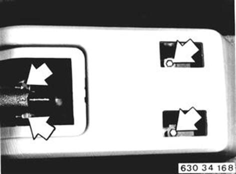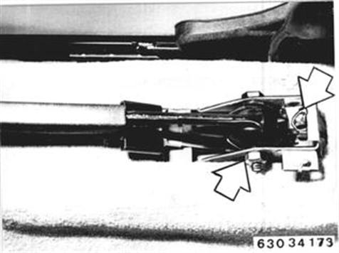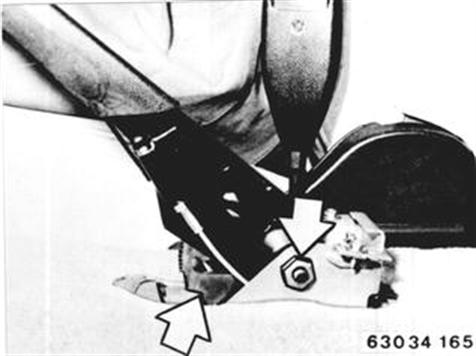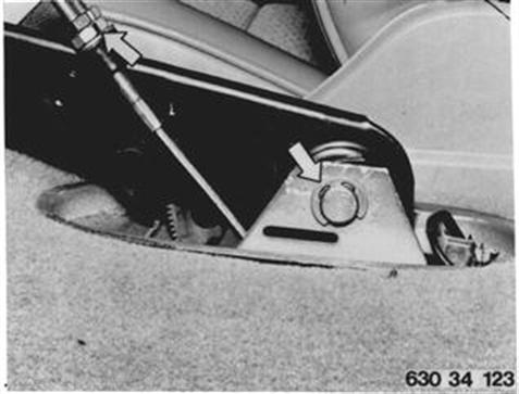 Fahrzeuge nach Modellwechsel 1982  HANDBREMSHEBEL AUS- UND EINBAUEN Abdeckbürste ausheben. Mittenkonsole ausbauen. Einstellmuttern der Handbremsseile abschrauben. |  |