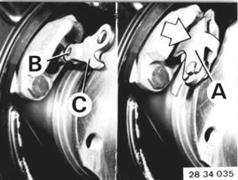 Spreizschloß prüfen, aus- und einbauen. Teil A nach vorne ziehen. Bolzen B herausdrücken. Teil C herausziehen. Einbauhinweis: Gleitfächen und Bolzen mit Molykote-Paste G dünn bestreichen. Handbremse einstellen 34 10 14. |  |
