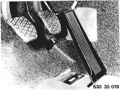 Fahrzeuge vor Modellwechsel 1982 FAHRFUSSHEBEL AUS- UND EINBAUEN Verkleidung unten Mitte ab- und anbauen 51 45 190. Klemmschraube vom Arm für Gasbetätigung lockern und Arm abnehmen. Einbauhinweis: Fahrfußhebelwelle nach rechts bis zum Anschlag drücken und Arm für Gasbetätigung auf Anschlag montieren. Anziehdrehmoment¹). Siehe technische Daten ¹) Siehe technische Daten