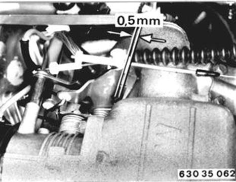 Einstellvorschrift für Gasbowdenzug: Für Schaltgetriebe: 1. Fahrfußhebel am Leerlaufanschlag 2. Drosselkappe in Leerlaufstellung (Startautomatik ausgeschaltet) 3. Bowdenzug spannungsfrei einstellen 4. Einstellschraube am Vollgasanschlag Fußhebelwerk so einstellen, daß bei Vollgasstellung der Fußhebelplatte am Vollastanschlag der Drosselklappe noch 0,5 mm Luft vorhanden ist. (Einstellschraube 1 1/2 Umdrehungen herausdrehen - entspricht 0,5 mm Luft). |  |