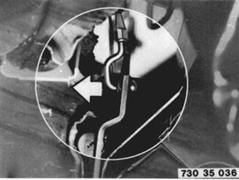 Sicherungshaken zusammendrücken und  Bowdenzug aus Motortrennwand herausziehen. Einbauhinweis: Gleitflächen fetten. Hebel und Bowdenzug auf Leichtgängigkeit prüfen. Bowdenzug einstellen. |  |