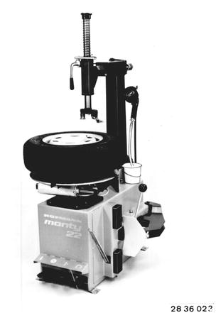 Montiersäule in Position schwenken oder klappen und einrasten lassen. Montierkopf einstellen, dabei ganz an den Felgenrad drücken und Hebel für Klemmvorrichtung umlegen, der Abstand des Montierkopfes stellt sich in der Regel automatisch ein. Das Ventil soll ca. 10 cm rechts vom Montierkopf stehen. Reifenwulst mit Montiereisen über den Montierfinger heben. Bei Alu-Felgen am besten einen beschichteten oder einen teilweise mit Schrumpfschlauch überzogenen Montierhebel verwenden. | ![]() |