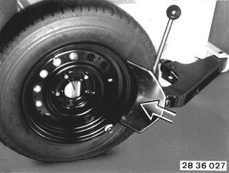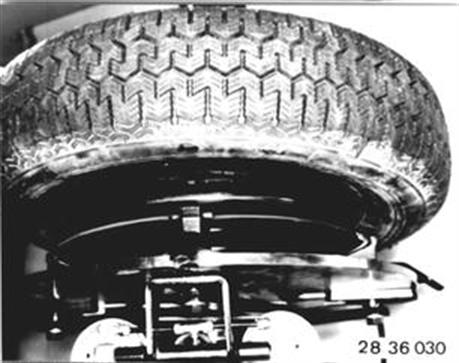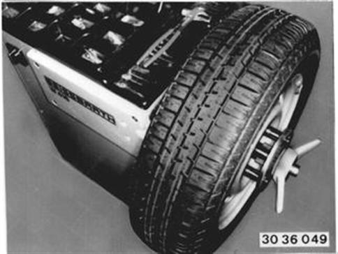 Meßvorrichtung 36 1 000 an Reifenlauffläche ansetzen. Rad von Hand durchdrehen und max. Reifenhöhenschlag*) messen. Hinweis Meßvorrichtung muß senkrecht zur Reifenlauffläche stehen. *) Siehe Technische Daten
