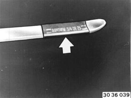 Meßvorrichtung 36 1 000 an Reifenflanke ansetzen. Rad von Hand durchdrehen und max. Reifenseitenschlag*) messen. Hinweis: Meßvorrichtung muß senkrecht zur Reifenflanke stehen. Nicht auf Reifenschriftfeld messen! *) Siehe Technische Daten