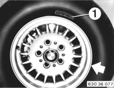 Allgemeine Hinweise zur Reifenmonatge Demontage --------------------------- Mit der Demontage am Ventil beginnen. Nach dem Abdrücken des Reifens vom Felgenhorn, Auswuchtgewichte entfernen, Reifenwülste in das Tiefbett drücken und gut mit Reifenmontierpaste**) bestreichen. Vor Montage des Reifens Scheibenrad sorgfältig reinigen und auf Beschädigung untersuchen. Bei jeder Schlauchlos-Reifenmontage muß das Ventil mit Ventileinsatz erneuert werden. Montage ------------- Reifenwülste mit Reifenmontierpaste**) bestreichen. Es ist besonders bei asymmetrischen Reifen auf seitenrichtige Reifenmontage zu achten. Bei diesen Reifen ist die "Außenseite" (1) gekennzeichnet. Außerdem soll der grüne Punkt am Reifen mit dem Körnerpunkt am Felgenhorn übereinstimmen. Reifen mit möglichst niedriger Wulstverspannung montieren, da sonst Gefahr der Beschädigung des Reifens besteht. Nach dem Aufpumpen (max. Fülldruck 4 bar) des Reifens visuelle Kontrolle des Reifensitzes anhand der Wulstkennrillen durchführen. **) Bezugsnachweis HWB | ![]() |