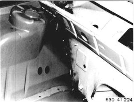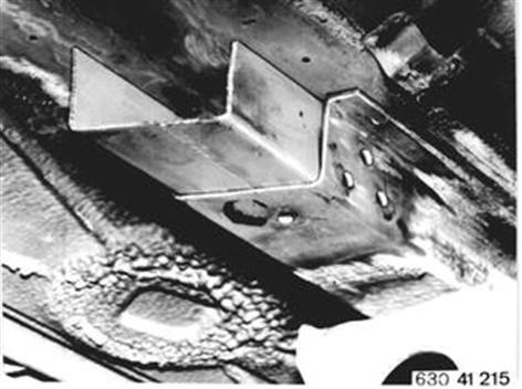 Stehengebliebenen Motorträger vorbereiten. Seitlichim Bereich des Verstärkungsblechs je 3 Löcher