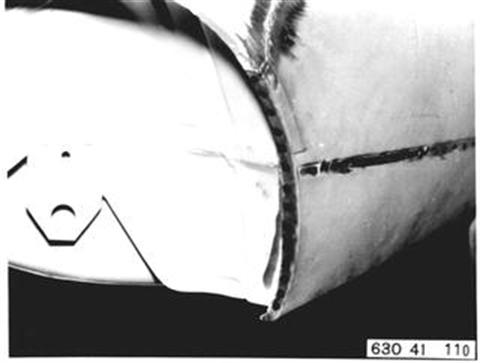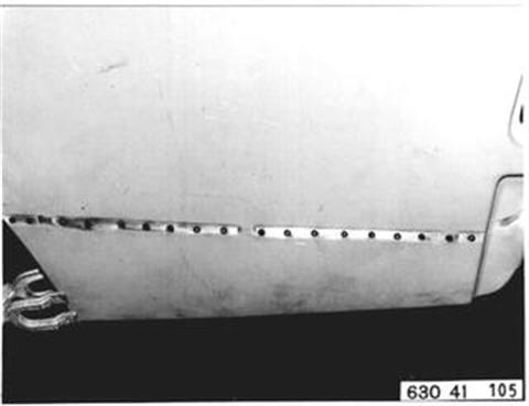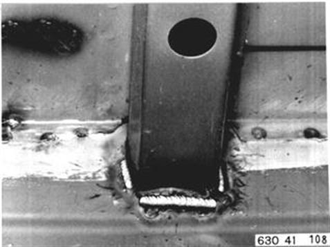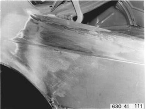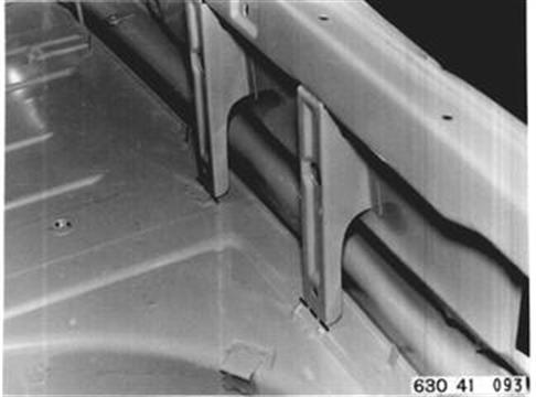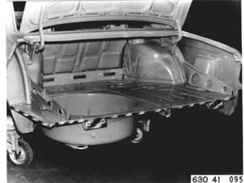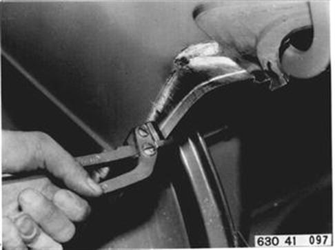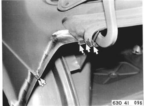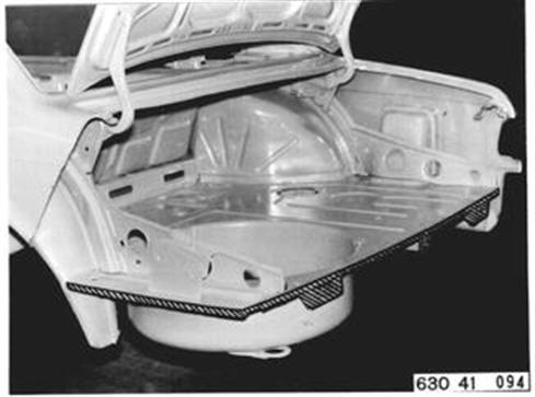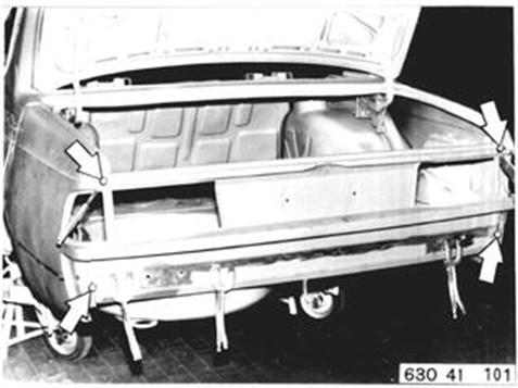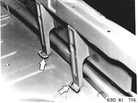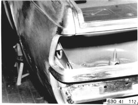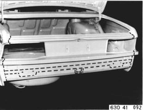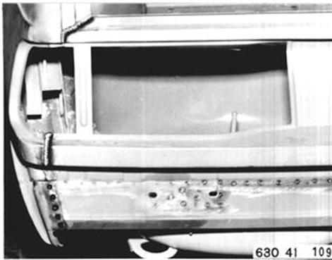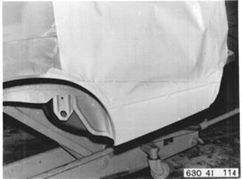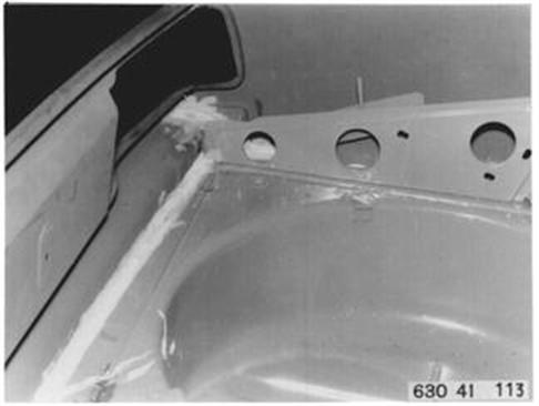 Fahrzeuge nach Modellwechsel 1982 SEITENWAND HINTEN LINKS (TEILERSATZ BIS RADHAUS) UND HECKABSCHLUSSBLECH ERSETZEN Hinweis beachten 41 - 001 Gepäckraummatte, Abdeckung für Reserverad, Reserverad, Verkleidung für Heckabschlußblech, Verkleidung für Seitenwand links und rechts, Heckklappendichtung, Heckklappenschloß, Schließzylinder, beide Heckleuchten beide Kennzeichenleuchten, Kabelbaum z. T., Schläuche vom Tauchrohrgeber, Auspuff, Tank, Stoßstange hinten, Stoßleisten rechts und links und Entlüftungsleitung ausbauen.