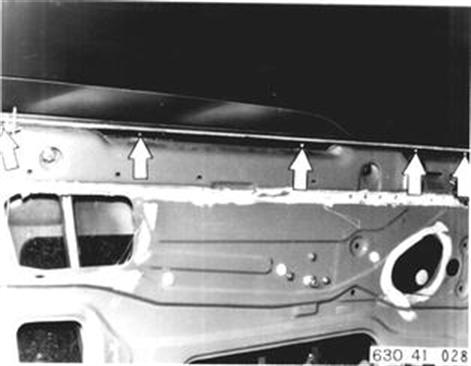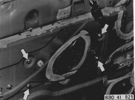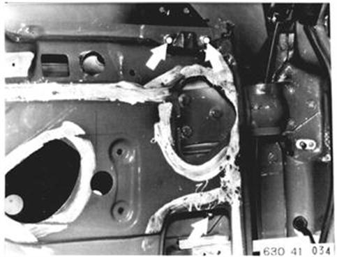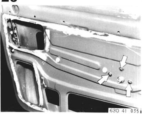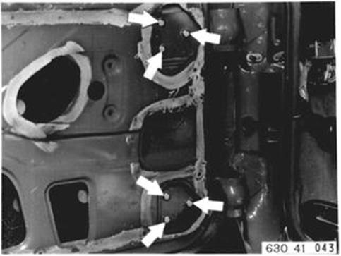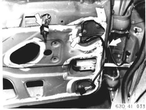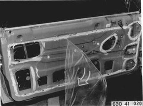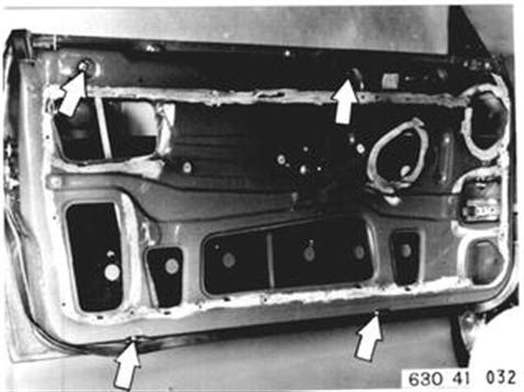Fahrzeuge nach Modellwechsel 1982  VORDERTÜR LINKS ODER RECHTS ERSETZEN Folgende Arbeiten sind in der angegebenen Reihenfolge durchzuführen. Der Einbau erfolgt in umgekehrter Reihenfolge. Neue Tür hohlraumversiegeln. Türverkleidung vorn abbauen siehe ...51 41 001 Türverkleidung -Oberteil abbauen siehe....51 41 020 Türfensterscheibe ausbauen siehe....51 32 170 Kurbelapparat ausbauen siehe....51 32 020 bzw. el. Fensterheber ausbauen siehe....51 33 000 Rückspiegel ausbauen siehe....51 16 000 Türschloß ausbauen siehe....51 21 090 Schließzylinder ausbauen siehe....51 21 140 Außengriff ausbauen siehe....51 21 170 Stoßleiste an Vordertür abbauen siehe....51 15 330 Türbremse ausbauen siehe....51 21 280 Kabelbaum aus Tür ausziehen | |