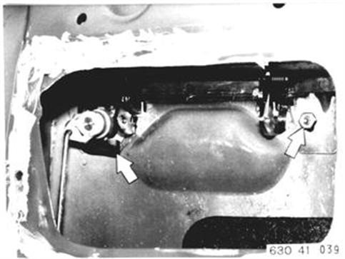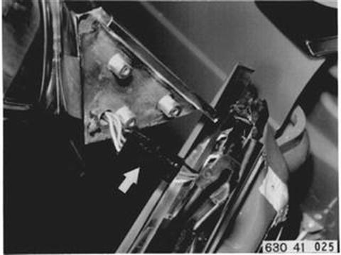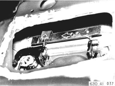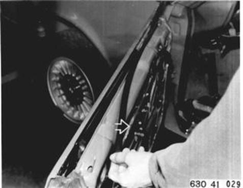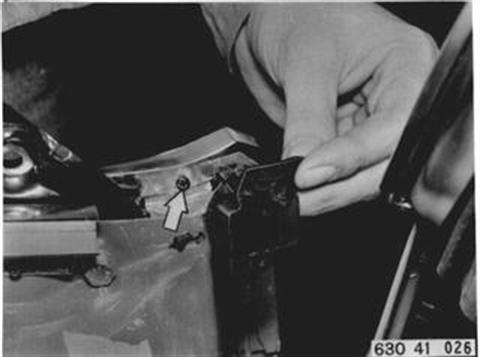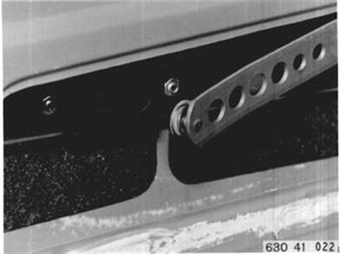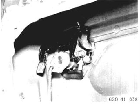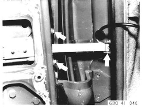 Fensterführung vorn ausbauen. Bolzen herausdrehen. Einbauhinweis: Fensterführung mit der Konterschraube so einstellen, daß Türfensterscheibe leichtgängig ist. |  |