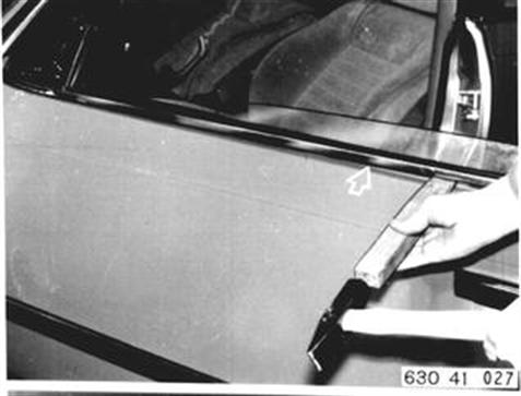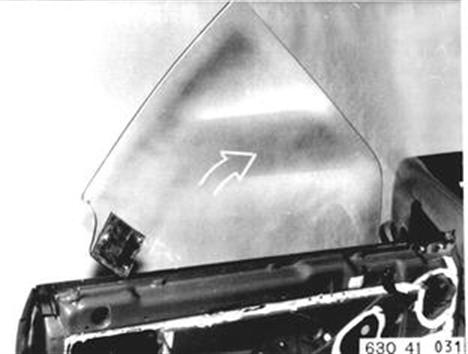 Beide Fensterführungsschienen ausbauen. Einbauhinweis: Schienen so einstellen, daß Türfensterscheibe leichtgängig ist und im geschlossenen Zustand an Türgummi gut anliegt. |  |